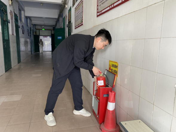 本次演练模拟火灾突发场景,流程紧凑有序。报警组成员快速触发火灾警报,并通知全体教职工。灭火组迅速响应,前往消防设备存放处取用灭火器,演示“提、拔、握、压”的标准操作步骤。疏散组人员统一指挥教职工,打湿毛巾遮掩口鼻,俯身扶墙,严格按照预定路线快速、有序撤离教学楼。整个过程衔接顺畅、行动高效。